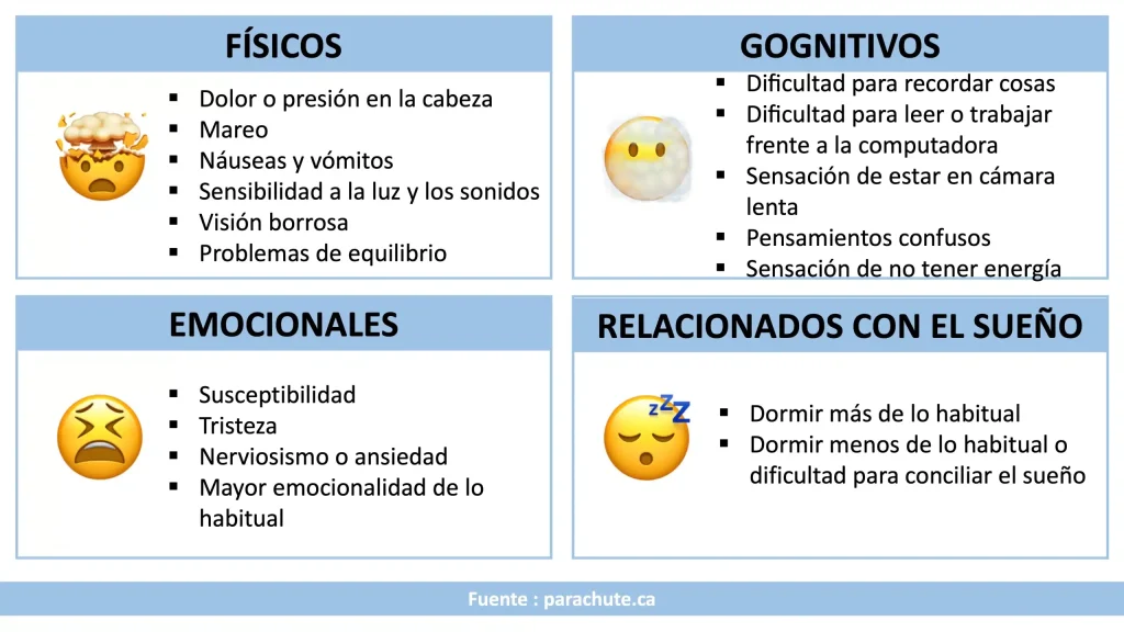 Algunos síntomas —dolores de cabeza, sensibilidad a la luz o al ruido, dificultad para dormir, problemas de memoria a corto plazo— pueden persistir durante varios días después de la lesión. Generalmente, desaparecen en la segunda semana de recuperación. Sin embargo, en algunos casos, pueden prolongarse durante meses e incluso años.